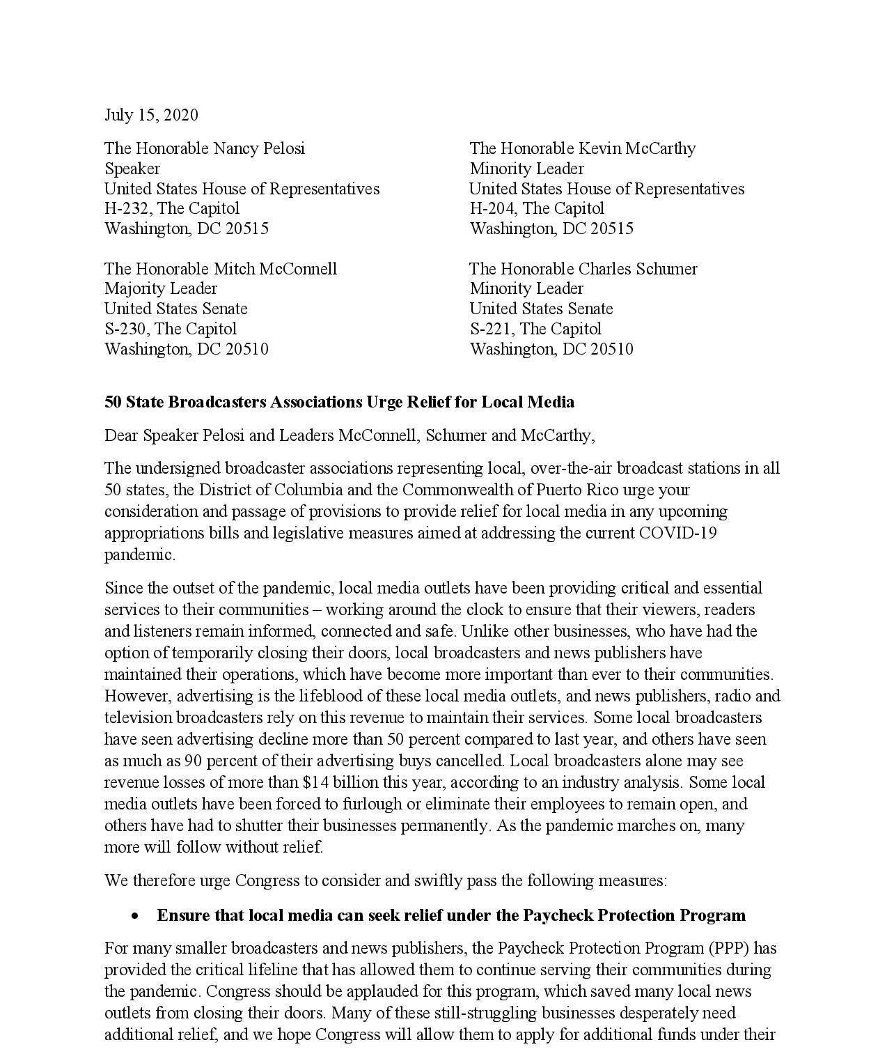 State broadcasters associations representing all fifty states, Washington D.C., and Puerto Rico signed a letter to House and Senate leadership this week urging the legislative bodies to pass legislation to provide relief to local media in any upcoming coronavirus aid packages.