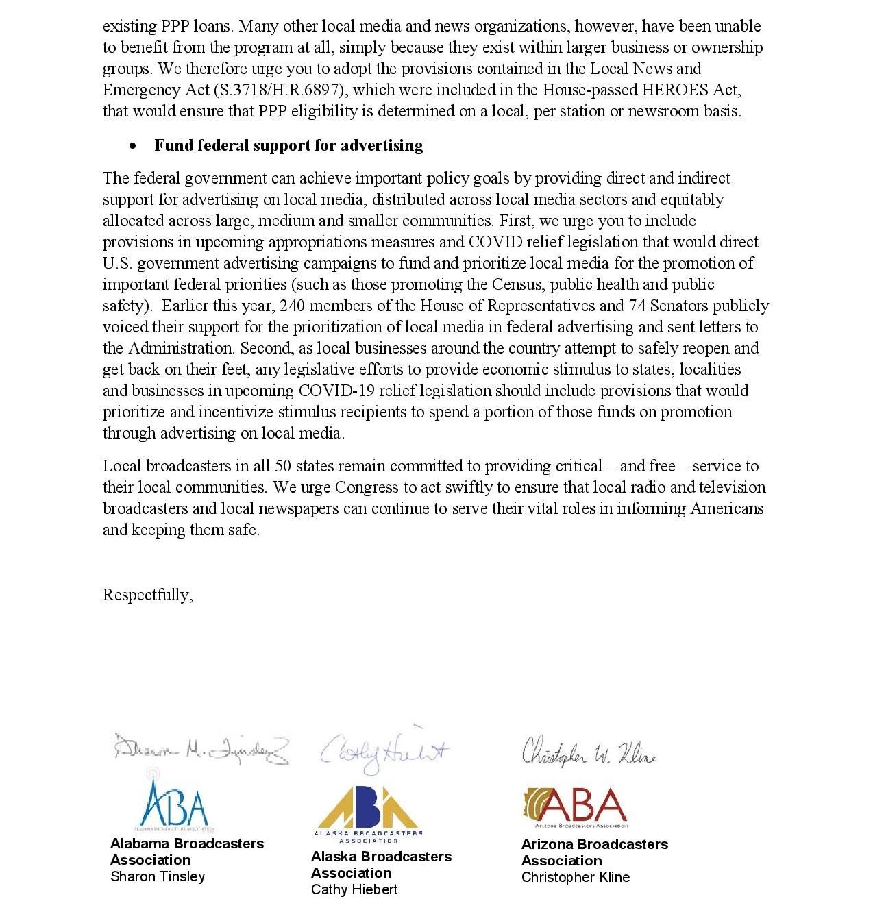 Secondly, the letter called for more direct Federal spending with local radio, television, and print media as well as a request to incentivize local small businesses to spend a portion of relief funds on marketing and advertising in local media.